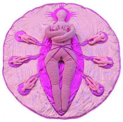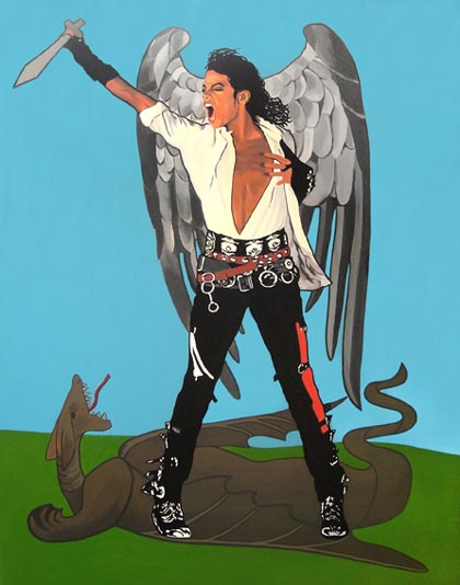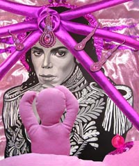 Od postaci wieko-formatowego Jacksona ubranego w swój tradycyjny, czarny  „kombinezon roboczy”, mającego u swych stóp wijącego się smoka odchodzą dziwne „kłącza”… To pępowina łącząca go z Saint – Mother, rzeźby Iwony Demko. Pompadour – różowa, cukierkowa, miękka i… ciepła Matka. „Matka Polka” jak sama artystka nazywa swoje dzieło to kobieta, która wiele dźwiga na swych barkach. Demko przyzwyczaiła nas do swoich rzeźb niczym „miękkich narkotyków”. Uzależnia jak narkotyk, wprowadza w wizjonerski świat mądrych kobiet, które świadome siebie i swych wartości odgrywają ważne role. Jaką tu odgrywa rolę? W połączeniu z „synem” jest symbolem matki. Razem z nim, złączeni a nie rozerwani. Święta Matka i Święty Michael Jackson wyniesieni na „ołtarzu cierpienia” za swoje role. Jaką rolę w wychowaniu i dzieciństwie młodego muzyka odegrała jego matka, jaką odgrywają dziś nasze matki? „Tresura” z jaką się spotkało rodzeństwo Jacksonów nieubłagalnie odbiło się na ich dorosłym życiu. Zaistnieć/istnieć/trwać – te hasła żądzą sceną, światem celebrytów. I tak też się stało, rękawica została rzucona. Z mikrofonem w dłoni niczym św. Jerzy z lancą rozpoczął karierę przyszły „król” popu. Opadła wrzawa, zgasły światła by ostatecznie zejść ze sceny i stać się „pomazańcem” fanów. A matka? Trwa przy nim, nierozerwalnie karmiąc go, ale czy mądrze?